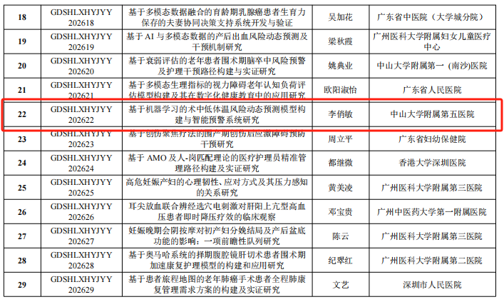 2025年12月20日,广东省护理学会、广东省岭南南丁格尔护理研究院发布2026年度科研课题评审结果,其中,由中山大学附属第五医院(简称“中大五院”)作为牵头单位,联合珠海中科先进技术研究院(简称“珠海先进院”)共同申报的《基于机器学习的术中低体温风险动态预测模型构建与智能预警系统研究》项目成功获批立项。