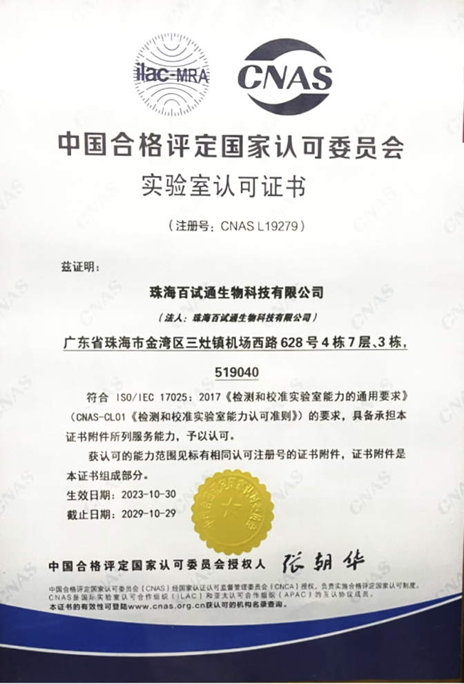 近日,珠海百试通生物科技有限公司(简称“珠海百试通”)获得了中国合格评定国家认可委员会颁发的实验室认可证书,即CNAS证书,证书编号:CNAS L 19279。此次认可范围涵盖药品、化妆品2大类的动物实验项目;标志着珠海百试通生物科技有限公司实验室能力更上一层台阶,为客户提供更优的检测服务。
